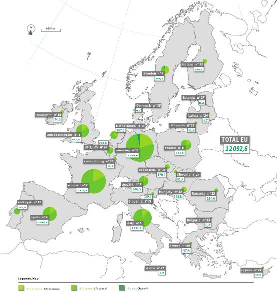 Лидерами по производству биотоплива в странах ЕС являются Германия и Франция, причем эти страны лидируют как по производству биодизеля, так и по производству биоэтанола. Значительный рывок в производстве биодизеля в 2009 году продемонстрировала Испания (прирост более 300%).