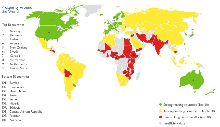 Исследовательский центр Legatum утверждает, что полученные данные основаны на анализе 110 стран по 89 различным показателям в 8 различных областях: экономике, бизнес-партнерству, управлению государством, образованию, здравоохранению, безопасности, личной свободе и социальном капитале.